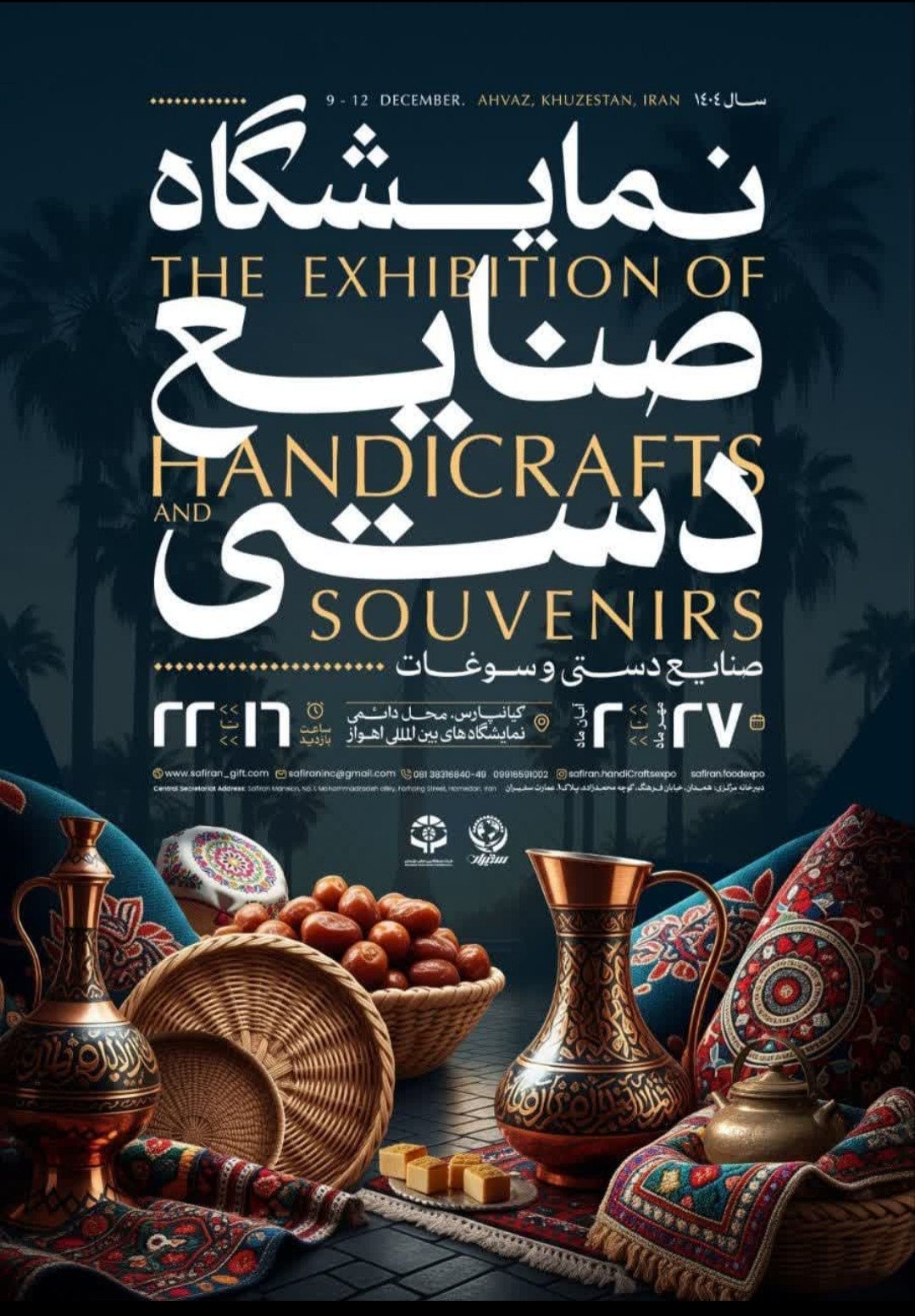 نمایشگاه تخصصی صنایع دستی 1404-07-27 عرضهی انواع صنایع دستی، محصولات هنری و آثار فرهنگی تاریخ برگزاری: 27 مهر تا 2 آبان 1404ساعت بازدید: 16 الی 22مکان: اهواز، محل دائمی نمایشگاههای بینالمللی خوزستان برگزارکننده: شرکت نمایشگاهی سفیران